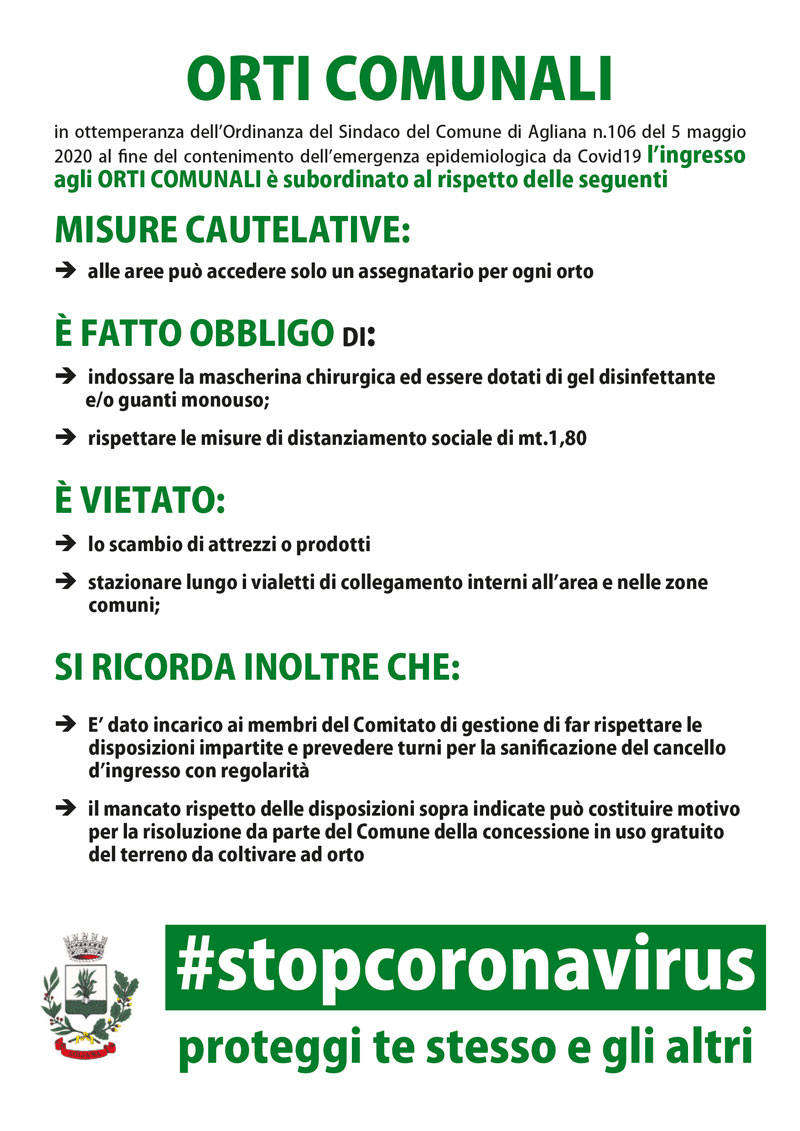 Con ordinanza n.106 del 5 giugno è stato rimosso il limite dell’accesso agli orti a giorni alterni rimangono invece le altre disposizioni di contenimento anti covid-19 fra cui l'accesso di una sola persona per orto.