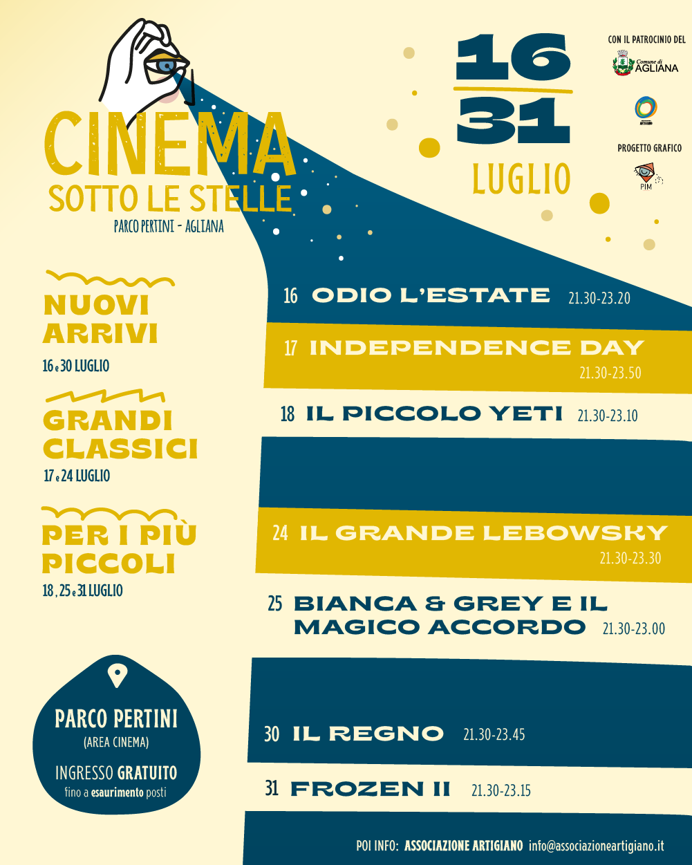 Ritorna il cinema nella splendida cornice del Parco Pertini. Grazie al contributo del Comune di Agliana, l'Associazione Culturale Artigiano propone la programmazione di sette film ad ingresso completamente gratuito nell'area solitamente utilizzata per gli spettacoli (ingresso Via Papa Giovanni XXIII).