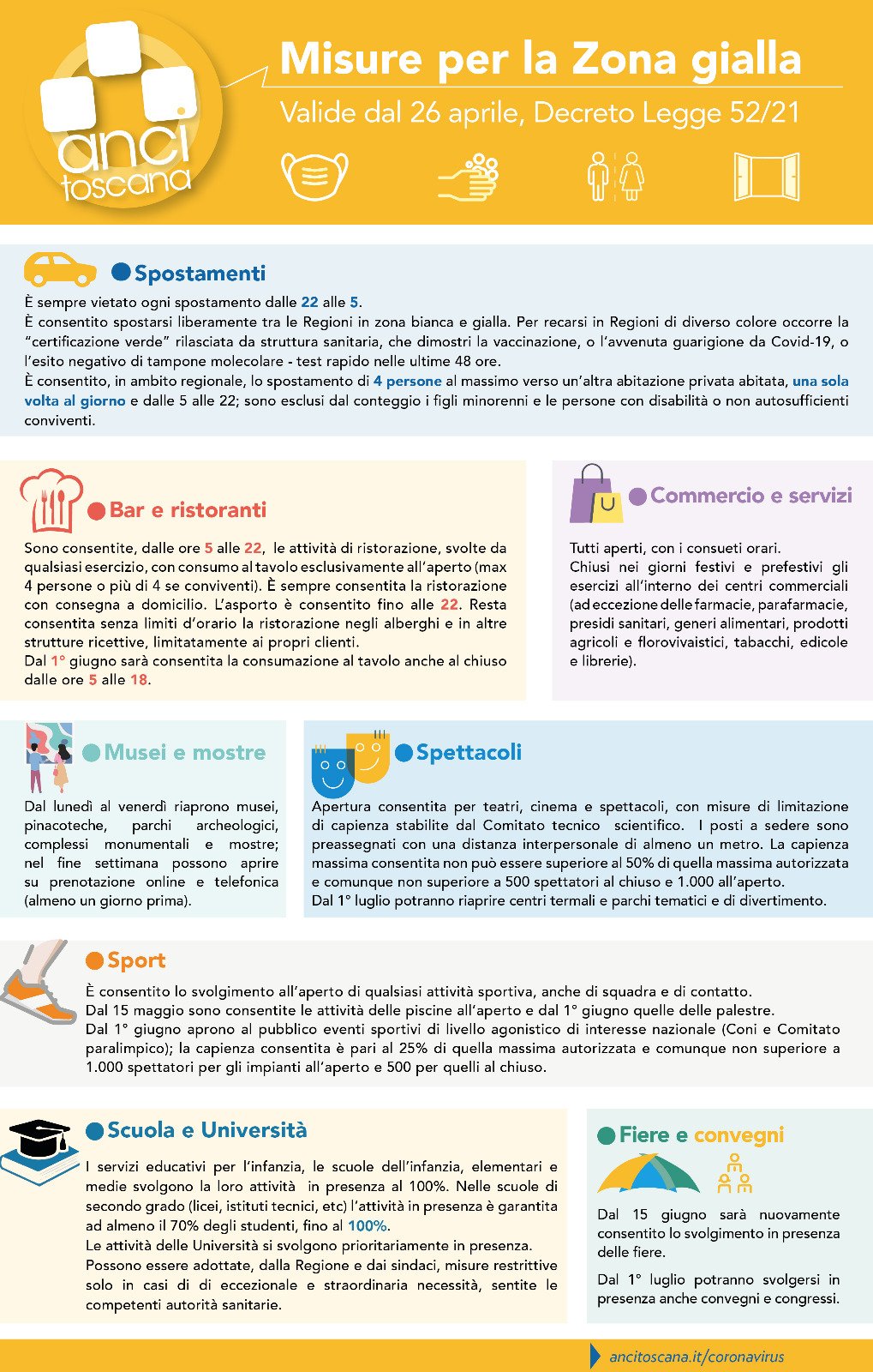 Da lunedì 26 aprile la toscana è zona gialla. Varranno così le disposizioni previste dal Decreto legge 22 aprile n.52