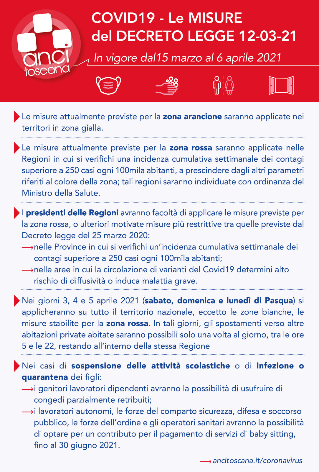 L'ordinanza regionale del Presidente Giani istituiva la zona rossa per la provincia di Pistoia fino a domenica 28 marzo 2021 compresa. Venerdì 26 marzo è poi intervenuta la decisione a livello nazionale di prevedere per l'intera regione toscana la zona rossa fino al 6 aprile 2021 compreso.