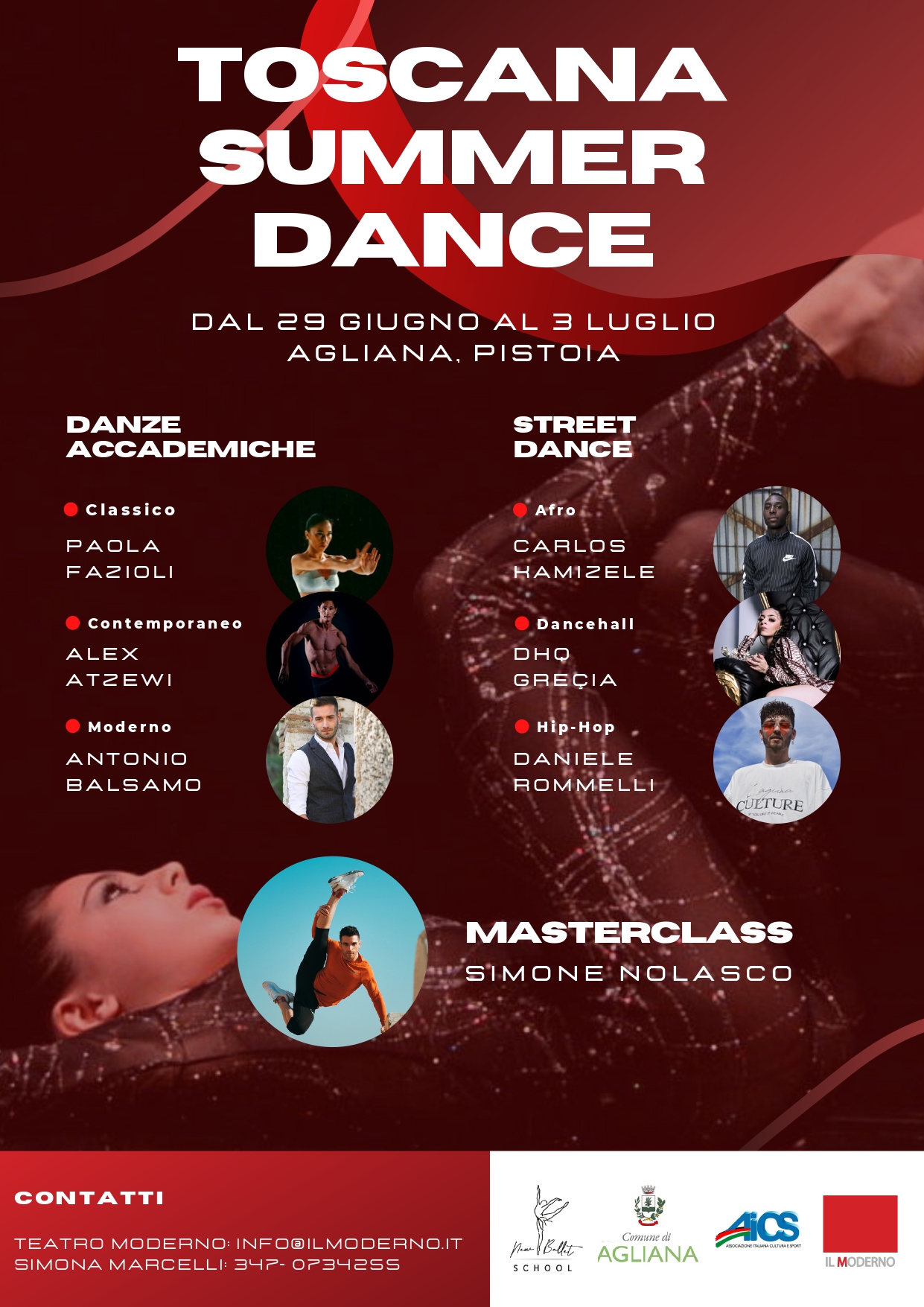 Grazie alla collaborazione fra New Ballett School e Associazione Il Moderno si terrà dal 29/06/2022 al 03/07/2022 il “Toscana Summer Dance”, una immersione nel mondo della danza con 7 grandi professionisti: Simone NOLASCO - Alex ATZEWI - Antonio BALSAMO - Daniele ROMMELLI - DHQ GRECIA - Carlos HAMIZELE - Paola FAZIOLI .