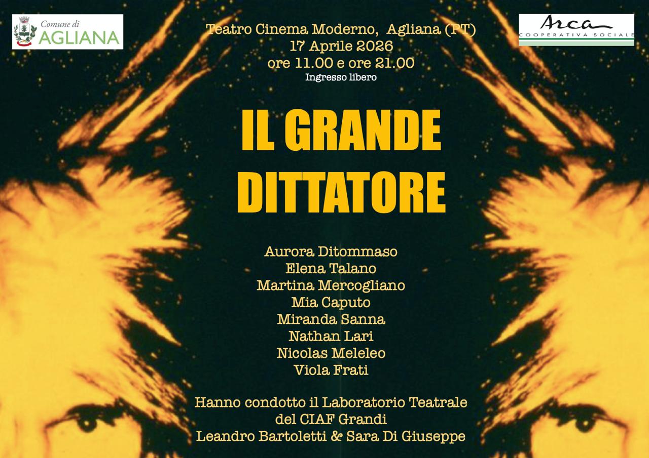 L'amministrazione è lieta di invitare la cittadinanza allo spettacolo teatrale delle ragazze e i ragazzi del Ciaf Grandi, il quale si terrà venerdì 17 aprile alle ore 21.00, presso il Teatro "Moderno" di Agliana.