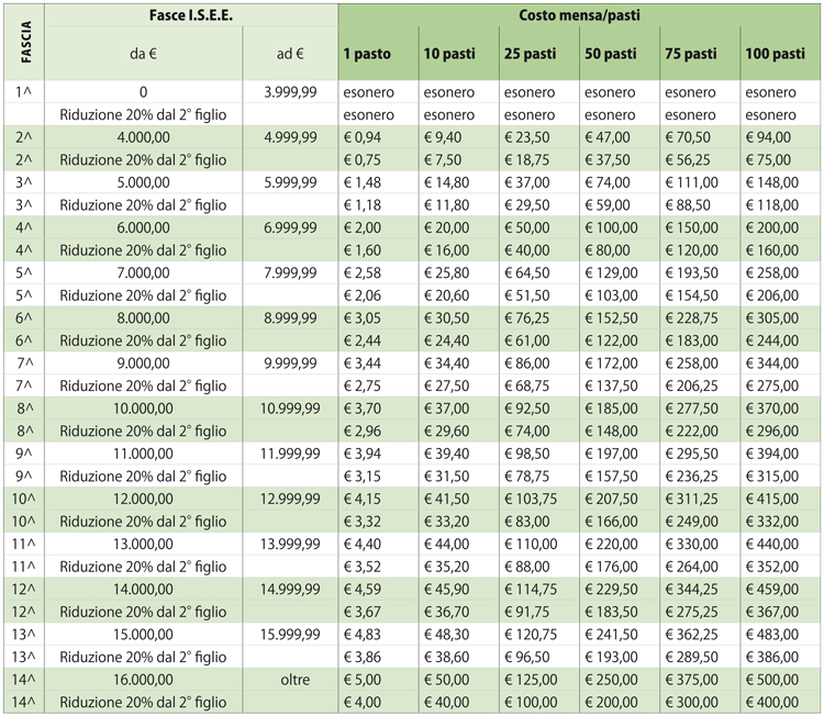 In Documenti pubblichiamo una tabella esemplificativa in allegato, divisa per fasce di pagamento, per le ricariche del servizio mensa.