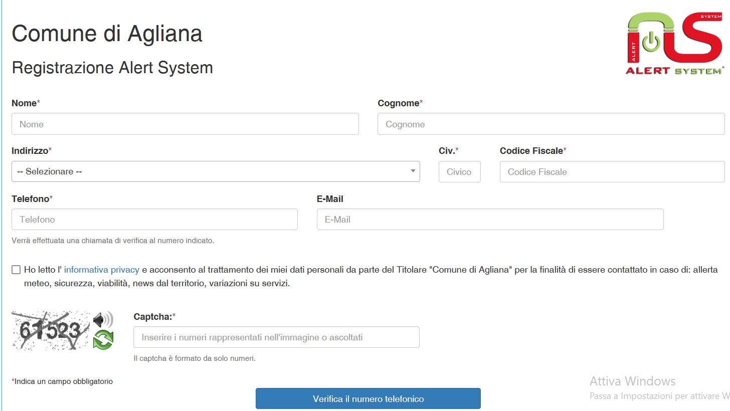 Iscriversi attraverso il sito del Comune di Agliana nel registro dell'Alert System compilando lo specifico modulo presente in pagina web