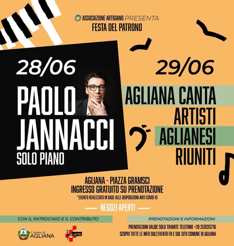 Nel rispetto delle misure di distanziamento dovute al covid19, grazie all’iniziativa dell’Associazione culturale Artigiano e al patrocinio e contributo del Comune di Agliana propone due serate di musica dal vivo, allo scopo di dare un segnale di vivacità e allietare la festa patronale: il 28 giugno “Paolo Jannacci, solo piano” e il 29 “Agliana Canta”, con la partecipazione di tanti artisti aglianesi allo scopo di dare un segnale di vivacità e allietare la festa patronale.