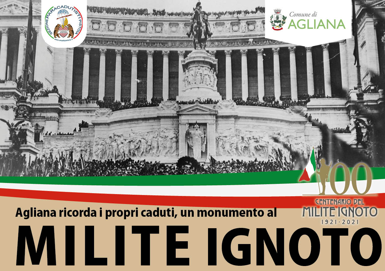 In occasione del centenario della traslazione della salma del milite ignoto dalla Basilica di Aquileia a Roma, dove fu sepolta con grandi onori in quello che diventerà l’Altare della Patria al Vittoriano, il Comune di Agliana in collaborazione con l’Associazione Nazionale Paracadusti d’Italia sez. di Pistoia, sabato 27 novembre alle ore 10,30, presso il Giardino Ovidio Sgatti in via Maria Callas, inaugurerà un monumento al Milite Ignoto così da ricordare il centenario e commemorare i sacrifici e gli eroismi di tanti singoli cittadini le cui salme mai furono identificate.