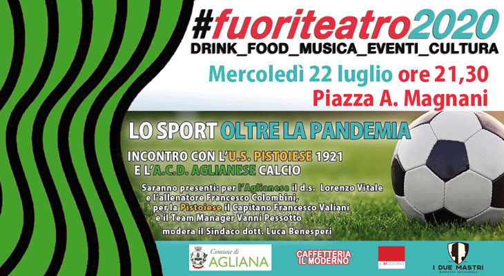 Continuano gli incontri #fuoriteatro, in Piazza Anna Magnani. Questa volta si parlerà di sport e più nello specifico di calcio. Verranno affrontati i tanti interrogativi che lo sport alle prese con il covid19 deve affrontare. Quale il futuro del calcio, sport di squadra che prevede il contatto, quali le difficoltà che le squadre maggiori e le squadre giovanili dovranno affrontare? Intorno a questi temi mercoledì prossimo 22 luglio alle ore 21,30 cercheranno di far chiarezza i rappresentanti dell'Aglianese e della Pistoiese insieme al Sindaco di Agliana, Luca Benesperi. Tutti sono invitati.