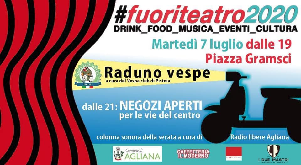 Martedì 7 luglio a partire dalle 19 in Piazza Gramsci si svolgerà a cura del Vespa club di Pistoia un "vesparaduno", lo scooter che dal 1946 è un simbolo del design italiano ed accompagna la storia del nostro Paese. Ad animare ancor più la serata, ci penseranno i negozi che dalle 21 saranno aperti in orario serale e la musica di sottofondo, diffusa nella zona e selezionata dall'Associazione Radio Libere Agliana.