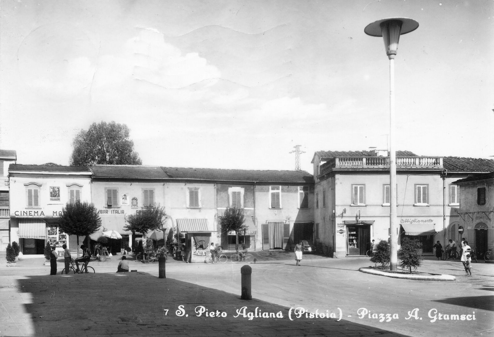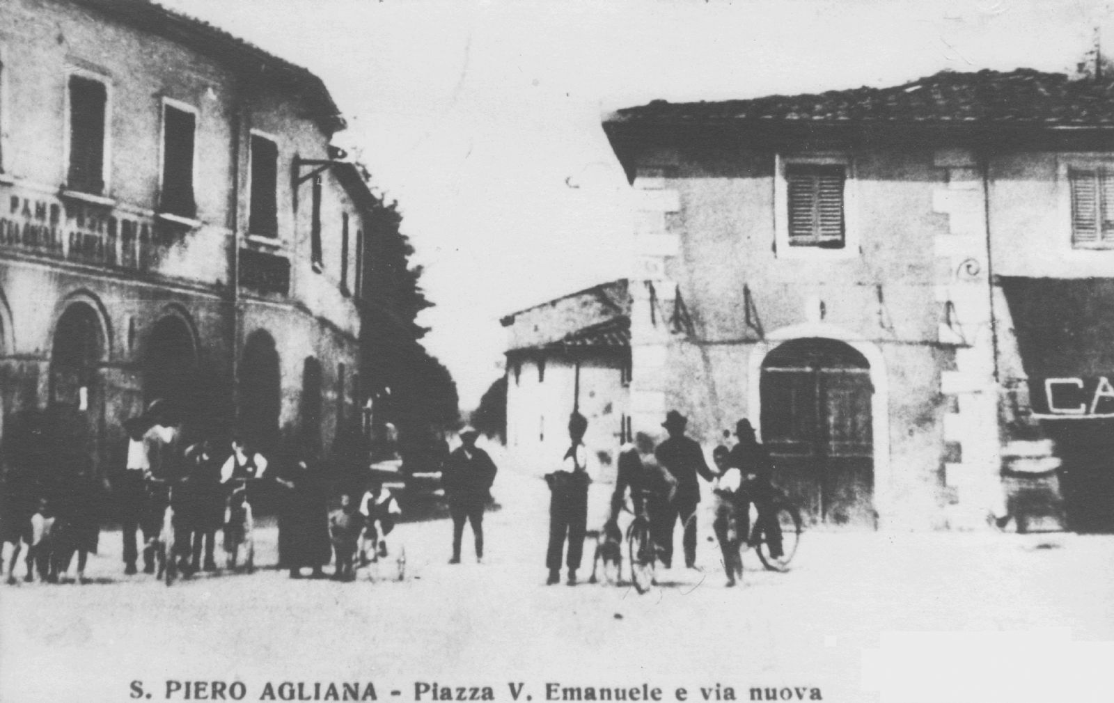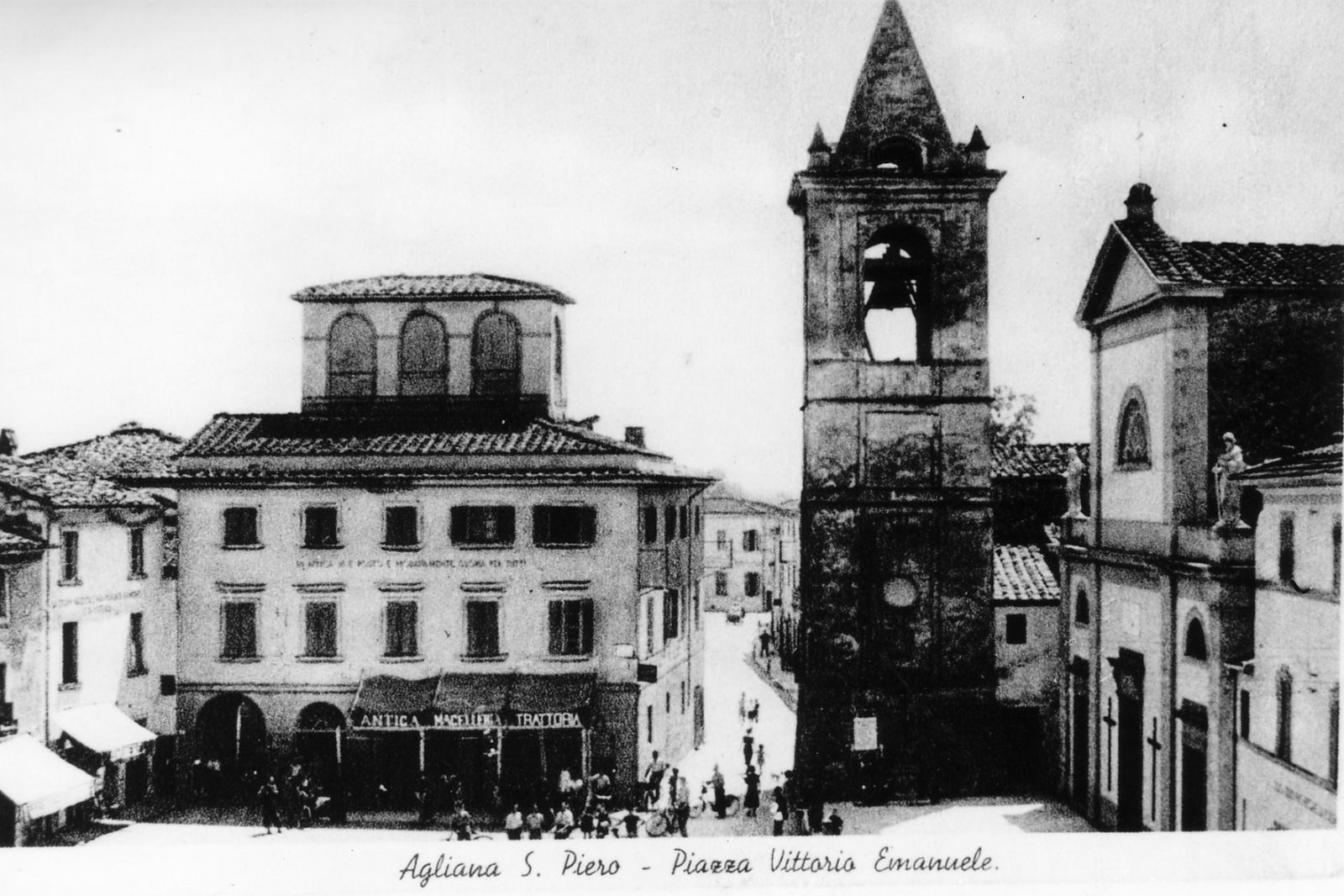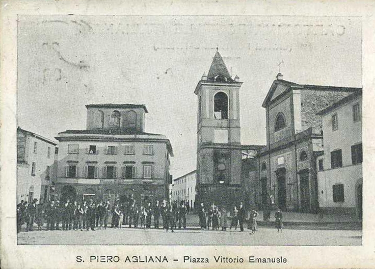 Piazza Vittorio Emanuele, attuale piazza A. Gramsci, in una cartolina del 1920. Sulla destra la Chiesa di S. Pietro ricostruita tra il 1869 e il 1872, palazzo Melani e a sinistra le piccole case ricavate nell’ex ospedale di S. Pietro, in parte a un piano.