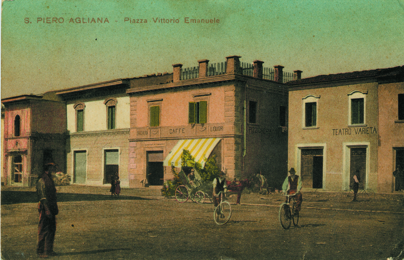 Piazza Vittorio Emanuele, attuale piazza A. Gramsci. La cartolina a colori risale ai primi del 1900, realizzata colorando a mano la lastra. Lo scorcio della piazza ci mostra i lavori quasi terminati delle casette a schiera realizzati dopo la rettifica della vecchia via di S. Piero, sono visibili il vecchio teatro Moderno e il Caffè. Il Teatro aveva la sua vecchia sala dove si trovava la biglietteria, in seguito fu notevolmente ampliato e oggi totalmente ricostruito.