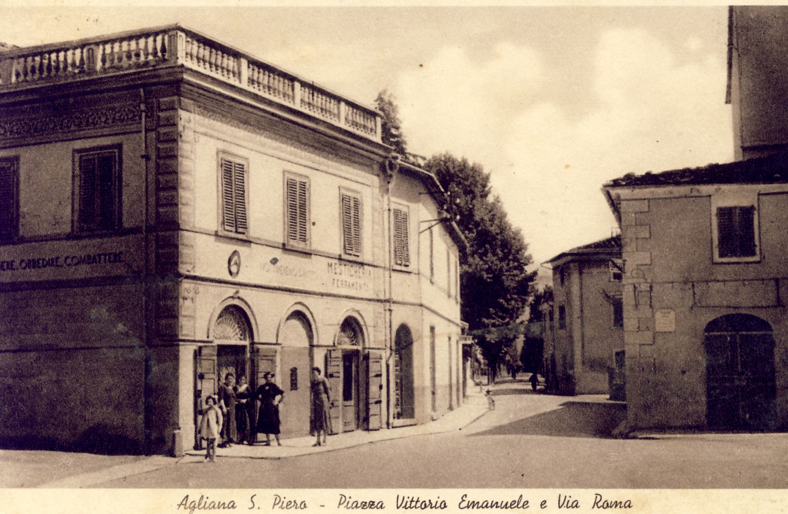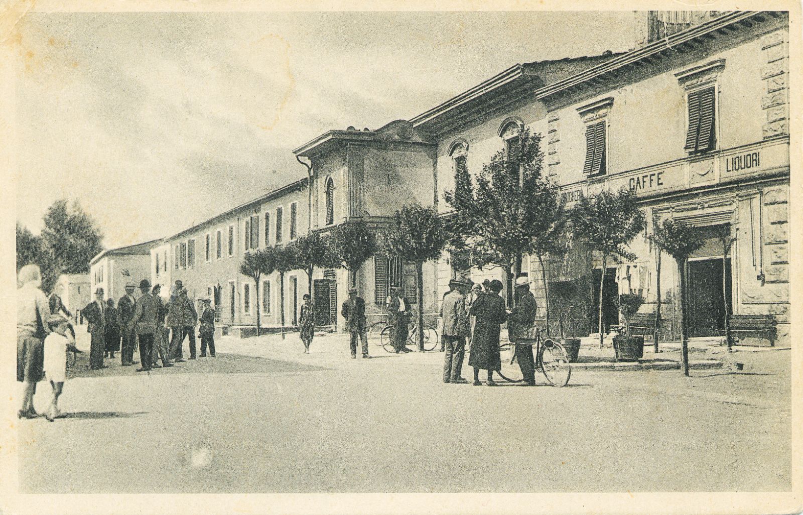 Piazza Vittorio Emanuele, oggi piazza A. Gramsci. Lo scorcio della piazza con la prospettiva del viale nuovo fa contrasto con le casette a un solo piano; in fondo a destra si nota la casa di Ermanno Mazzei ancora da ristrutturare. Anche le case in primo piano a destra sono ancora a un piano, mentre l’appalto dei sali e tabacchi è privo delle decorazioni pittoriche della facciata. La cartolina risale al 1920.