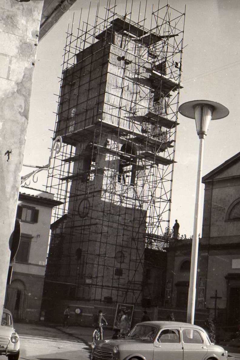 Piazza Vittorio Emanuele, attuale piazza A. Gramsci, cartolina del 1937. Sulla facciata della chiesa si notano le due statue donate dai coniugi Berti appunto in quell’anno; si nota sulla facciata del campanile le tracce del tetto a capanna della vecchia chiesa.