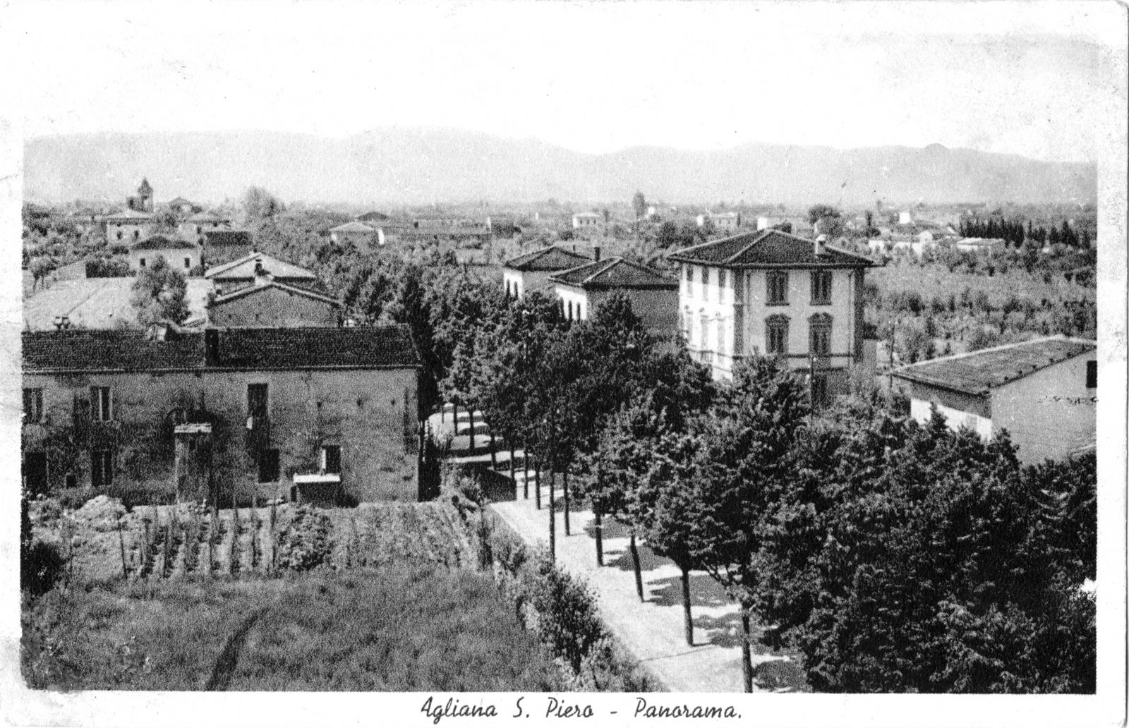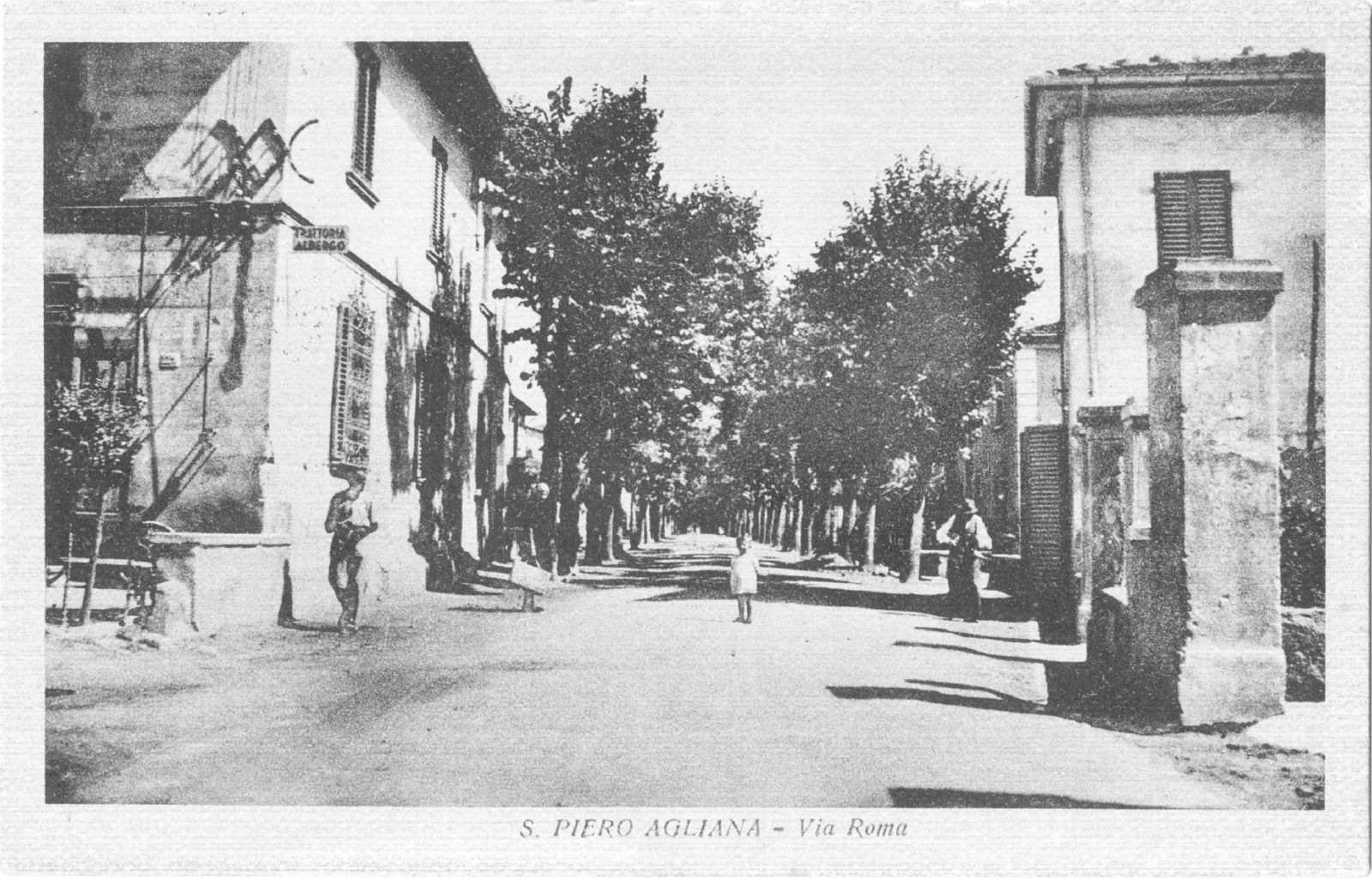 Appena ottenuta la ricostituzione del comune di Agliana, la nuova amministrazione decise la costruzione di una nuova e comoda via di accesso alla Piazza di S. Piero, fu decisa la rettifia e lingrandimeto della vecchia Via delle Redole. il grade viale alberato detto viale nuovo e in seguito (1932) Viale Roma, che in questa car-tolina del 1914, vediamo popolato di persone tra i quali Guido Guarducci, primo Sindaco di Agliana, ai lati la campagna ancora libera dalle costruzioni.