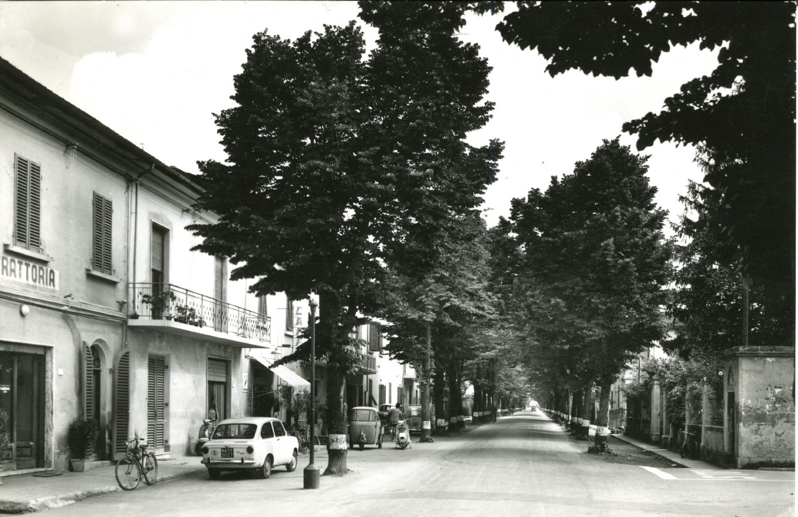 Viale Roma negli anni sessanta, a sinistra si nota la trattoria di Ovidio mentre a destra il tabernacolo inserito nelle mura di cinta della villa di Icilio Scuffi.